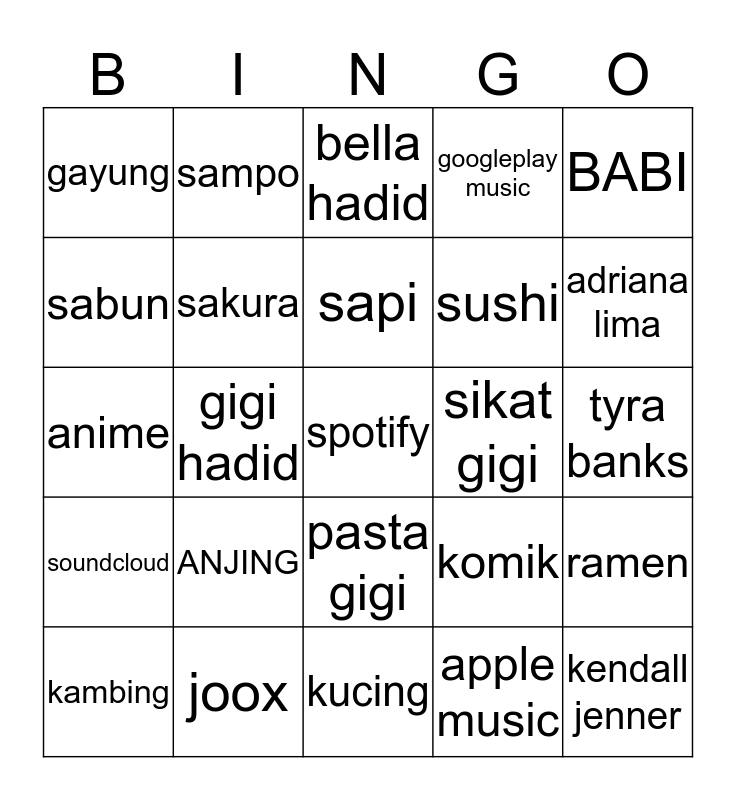 This bingo card has 25 words: ANJING, kucing, sapi, kambing, BABI, gayung, sabun, sampo, sikat gigi, pasta gigi, sushi, anime, komik, ramen, sakura, kendall jenner, tyra banks, bella hadid, adriana lima, gigi hadid, spotify, joox, soundcloud, googleplay music and apple music.