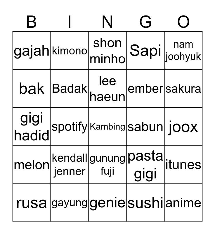 This bingo card has a free space and 24 words: kendall jenner, gayung, lee haeun, rusa, nam joohyuk, gajah, bak, kimono, sabun, gunung fuji, ember, gigi hadid, pasta gigi, itunes, Badak, sushi, joox, shon minho, sakura, spotify, anime, melon, Sapi and genie.