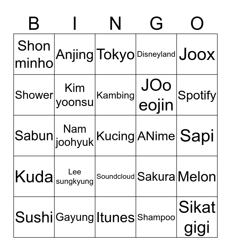 This bingo card has a free space and 24 words: Lee sungkyung, Gayung, Kambing, Sushi, Joox, Shon minho, Shower, Anjing, ANime, Soundcloud, JOo eojin, Sabun, Sakura, Melon, Kim yoonsu, Shampoo, Sapi, Tokyo, Spotify, Nam joohyuk, Sikat gigi, Kuda, Disneyland and Itunes.