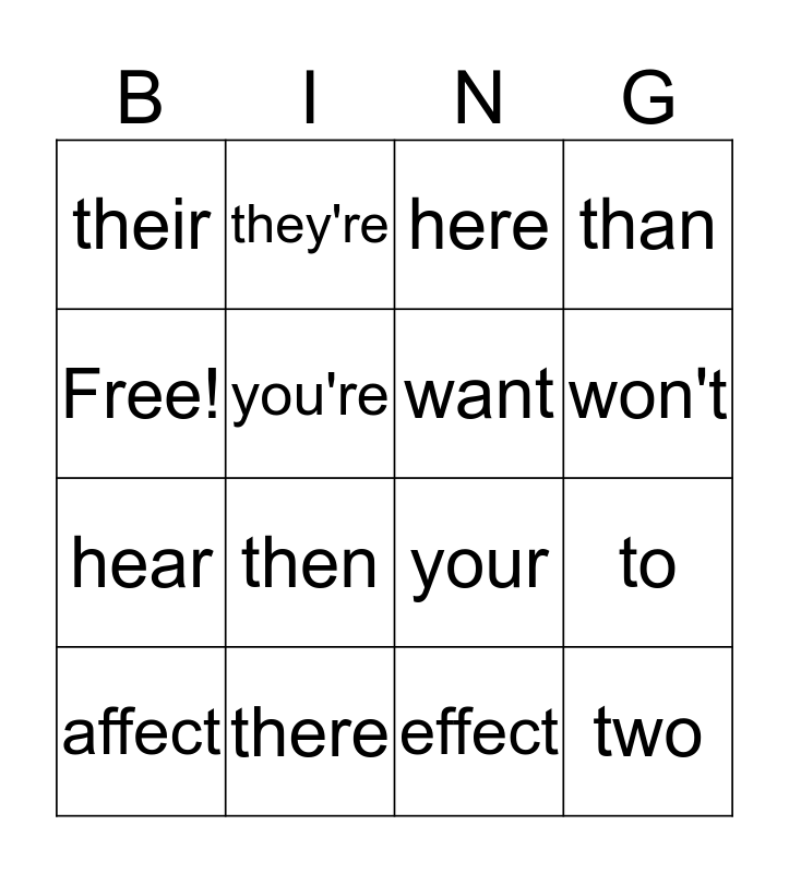 This bingo card has 16 words: there, to, here, their, hear, they're, your, effect, Free!, you're, affect, than, then, won't, want and two.
