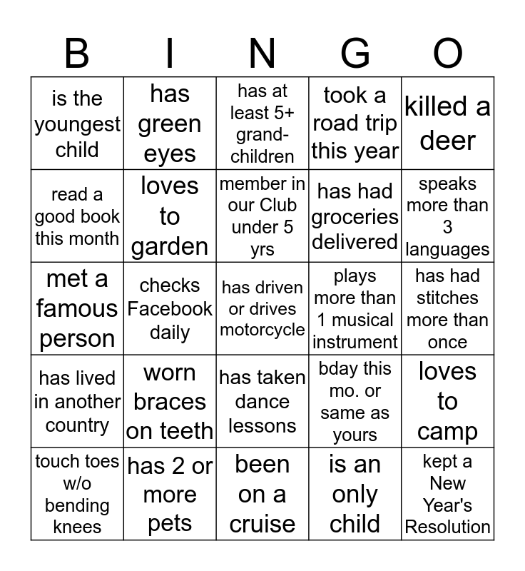 This bingo card has a free space and 24 words: worn braces on teeth, has 2 or more pets, member in our Club under 5 yrs, touch toes w/o bending knees, killed a deer, is the youngest child, read a good book this month, has green eyes, plays more than 1 musical instrument, has taken dance lessons, has had groceries delivered, met a famous person, bday this mo. or same as yours, loves to camp, loves to garden, is an only child, has had stitches more than once, has at least 5+ grand-children, speaks more than 3 languages, checks Facebook daily, kept a New Year's Resolution, has lived in another country, took a road trip this year and been on a cruise.