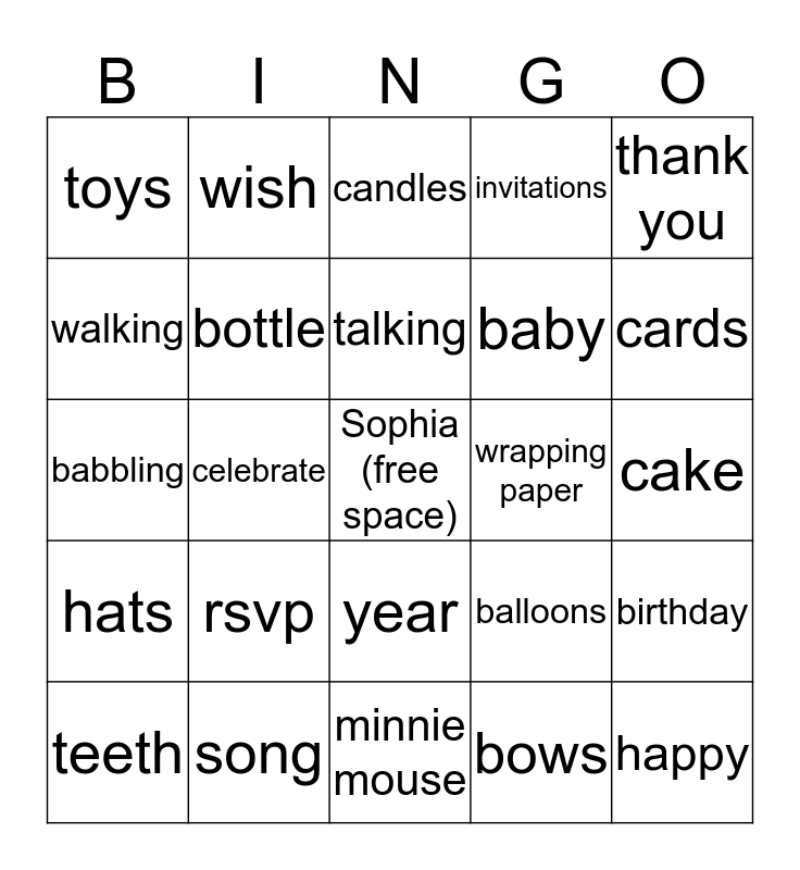 This bingo card has a free space and 24 words: rsvp, song, talking, teeth, thank you, toys, walking, wish, wrapping paper, year, baby, babbling, balloons, birthday, bottle, bows, cake, candles, cards, celebrate, happy, hats, invitations and minnie mouse.