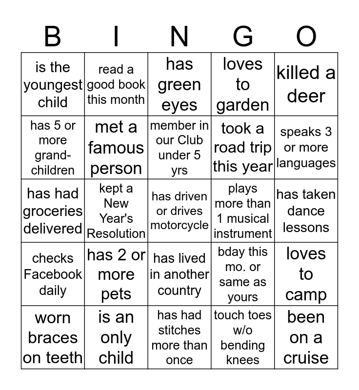 This bingo card has a free space and 24 words: worn braces on teeth, has 2 or more pets, member in our Club under 5 yrs, touch toes w/o bending knees, killed a deer, is the youngest child, read a good book this month, has green eyes, plays more than 1 musical instrument, has taken dance lessons, has had groceries delivered, met a famous person, bday this mo. or same as yours, loves to camp, has 5 or more grand-children, is an only child, has had stitches more than once, loves to garden, speaks 3 or more languages, checks Facebook daily, kept a New Year's Resolution, has lived in another country, took a road trip this year and been on a cruise.