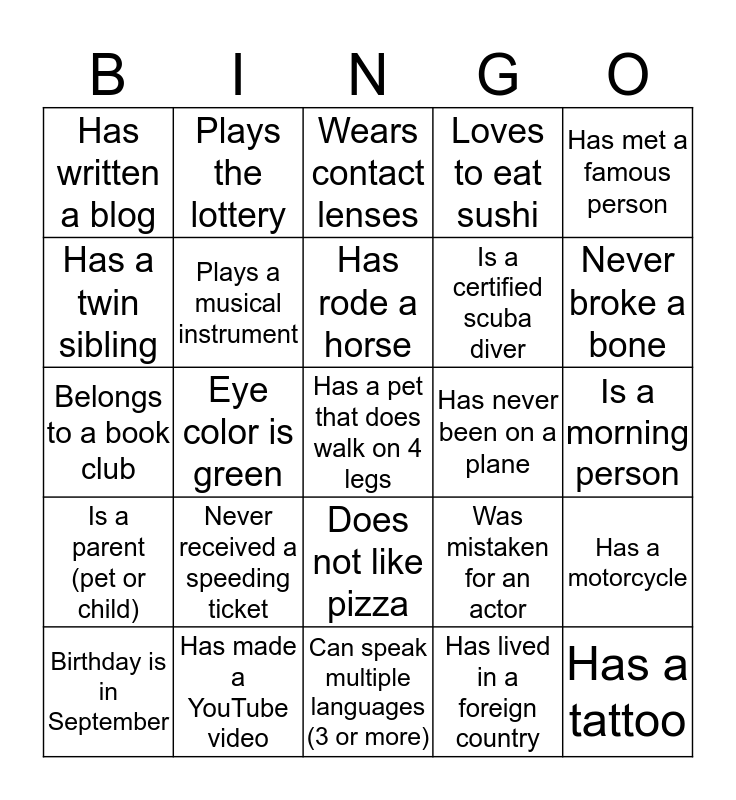 This bingo card has 25 words: Never received a speeding ticket, Can speak multiple languages (3 or more), Has rode a horse, Birthday is in September, Has met a famous person, Has written a blog, Has a twin sibling, Plays the lottery, Has never been on a plane, Does not like pizza, Is a certified scuba diver, Belongs to a book club, Was mistaken for an actor, Has a motorcycle, Plays a musical instrument, Has a tattoo, Is a morning person, Wears contact lenses, Never broke a bone, Eye color is green, Has a pet that does walk on 4 legs, Has made a YouTube video, Is a parent (pet or child), Loves to eat sushi and Has lived in a foreign country.