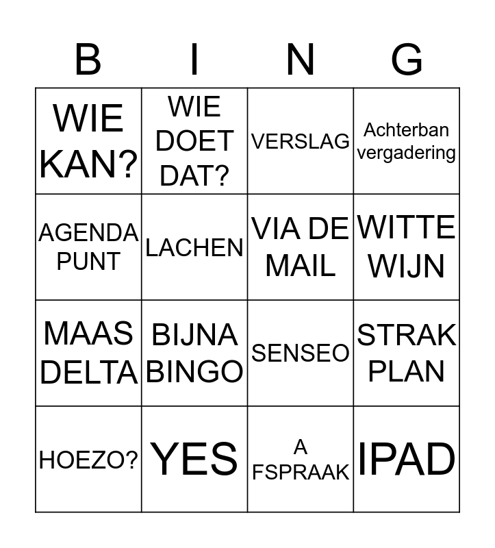 This bingo card has 16 words: YES, STRAK PLAN, VERSLAG, WIE KAN?, MAAS DELTA, WIE DOET DAT?, SENSEO, A FSPRAAK, AGENDA PUNT, LACHEN, HOEZO?, Achterban vergadering, BIJNA BINGO, WITTE WIJN, VIA DE MAIL and IPAD.