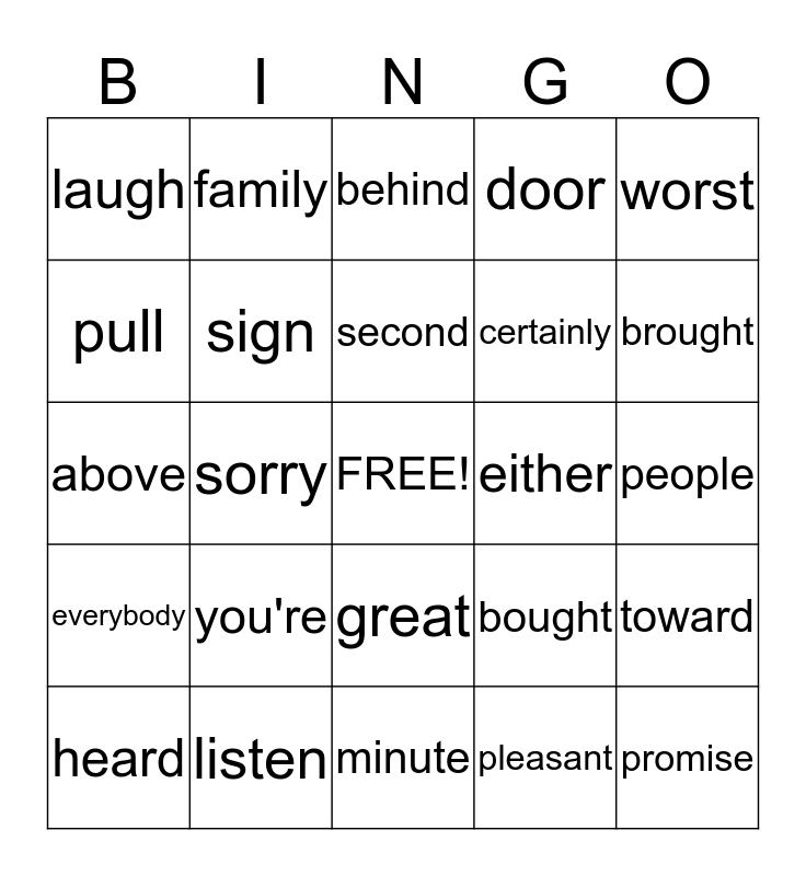 This bingo card has a free space and 24 words: you're, listen, second, heard, worst, laugh, pull, family, either, great, certainly, above, bought, toward, sign, pleasant, people, behind, brought, sorry, promise, everybody, door and minute.