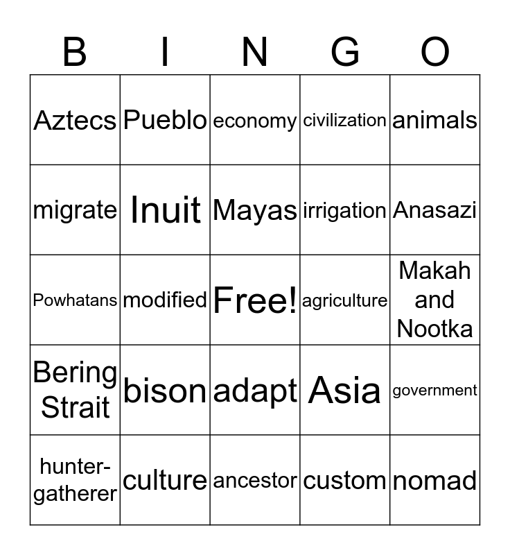 This bingo card has a free space and 24 words: bison, culture, Mayas, hunter-gatherer, animals, Aztecs, migrate, Pueblo, agriculture, adapt, irrigation, Powhatans, Asia, government, Inuit, custom, Makah and Nootka, economy, Anasazi, modified, nomad, Bering Strait, civilization and ancestor.