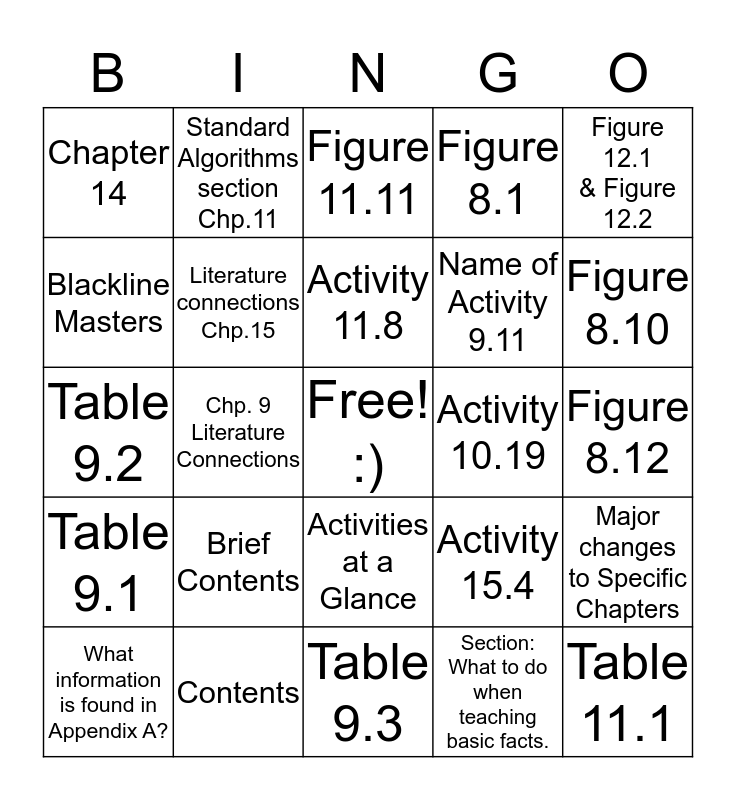 This bingo card has a free space and 24 words: Brief Contents, Contents, Activity 11.8, What information is found in Appendix A?, Figure 12.1 & Figure 12.2, Chapter 14, Blackline Masters, Standard Algorithms section Chp.11, Activity 10.19, Activities at a Glance, Name of Activity 9.11, Table 9.2, Activity 15.4, Major changes to Specific Chapters, Literature connections Chp.15, Section: What to do when teaching basic facts., Figure 8.12, Figure 11.11, Figure 8.10, Chp. 9 Literature Connections, Table 11.1, Table 9.1, Figure 8.1 and Table 9.3.