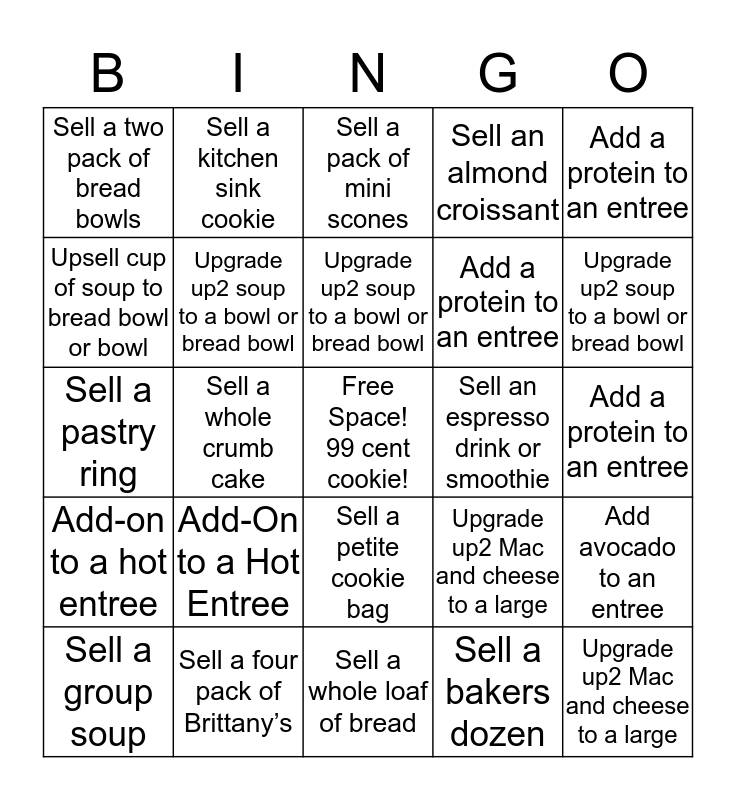 This bingo card has a free space and 24 words: Add-On to a Hot Entree, Sell a four pack of Brittany’s, Upgrade up2 soup to a bowl or bread bowl, Sell a group soup, Add a protein to an entree, Sell a two pack of bread bowls, Upsell cup of soup to bread bowl or bowl, Sell a kitchen sink cookie, Sell an espresso drink or smoothie, Sell a petite cookie bag, Add a protein to an entree, Sell a pastry ring, Upgrade up2 Mac and cheese to a large, Add avocado to an entree, Upgrade up2 soup to a bowl or bread bowl, Sell a bakers dozen, Add a protein to an entree, Sell a pack of mini scones, Upgrade up2 soup to a bowl or bread bowl, Sell a whole crumb cake, Upgrade up2 Mac and cheese to a large, Add-on to a hot entree, Sell an almond croissant and Sell a whole loaf of bread.