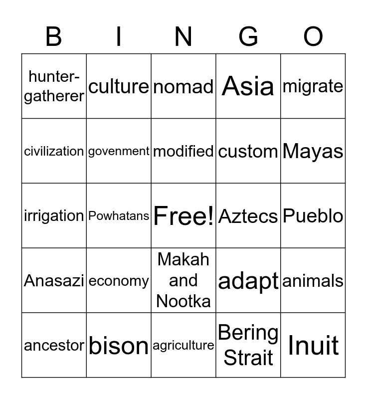 This bingo card has a free space and 24 words: economy, bison, modified, ancestor, migrate, hunter-gatherer, civilization, culture, Aztecs, Makah and Nootka, custom, irrigation, adapt, animals, govenment, Bering Strait, Pueblo, nomad, Mayas, Powhatans, Inuit, Anasazi, Asia and agriculture.