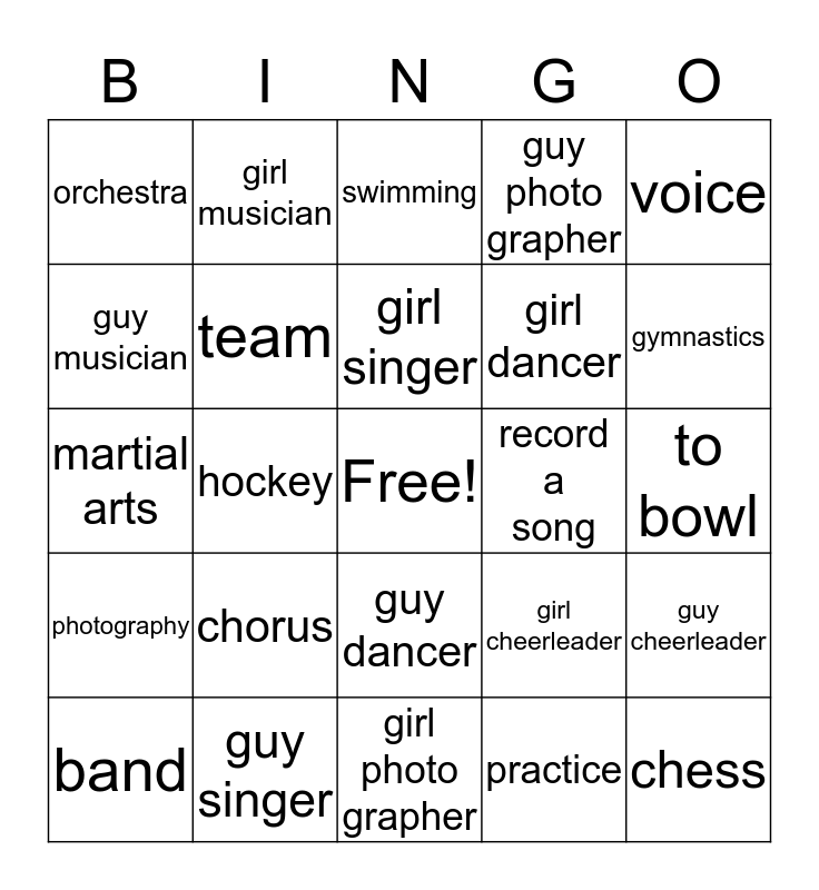 This bingo card has a free space and 24 words: chorus, guy singer, girl singer, band, voice, orchestra, guy musician, girl musician, record a song, guy dancer, girl dancer, martial arts, girl cheerleader, guy cheerleader, team, practice, to bowl, swimming, gymnastics, hockey, chess, photography, guy photo grapher and girl photo grapher.