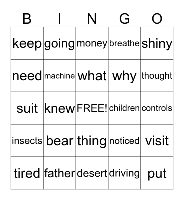 This bingo card has a free space and 24 words: bear, father, what, tired, shiny, keep, need, going, children, thing, why, suit, noticed, visit, machine, driving, controls, money, thought, knew, put, insects, breathe and desert.