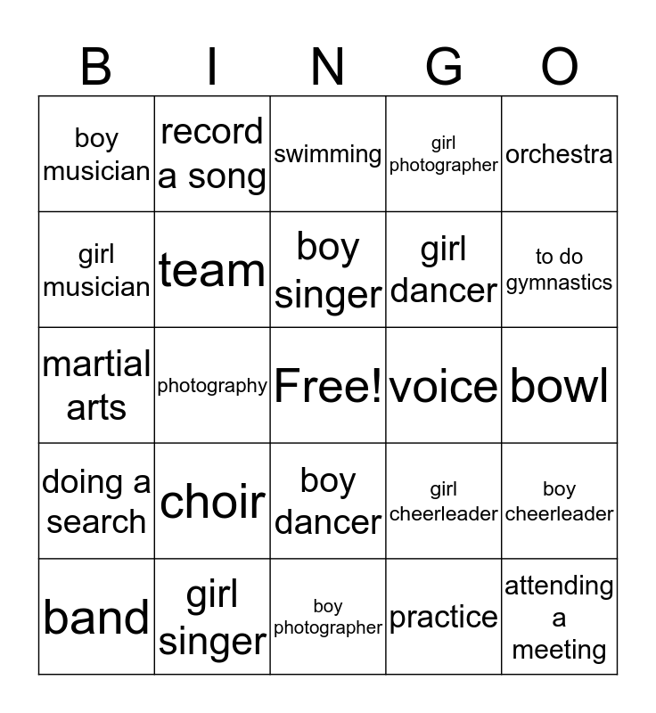 This bingo card has a free space and 24 words: choir, girl singer, boy singer, band, orchestra, boy musician, girl musician, record a song, voice, boy dancer, girl dancer, martial arts, girl cheerleader, boy cheerleader, team, practice, bowl, swimming, to do gymnastics, photography, attending a meeting, doing a search, girl photographer and boy photographer.