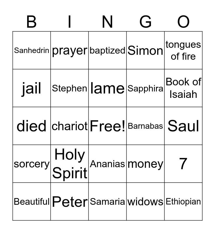 This bingo card has a free space and 24 words: Holy Spirit, Peter, lame, Beautiful, tongues of fire, Sanhedrin, jail, prayer, Barnabas, Ananias, Sapphira, died, money, 7, Stephen, widows, Saul, baptized, Book of Isaiah, chariot, Ethiopian, sorcery, Simon and Samaria.