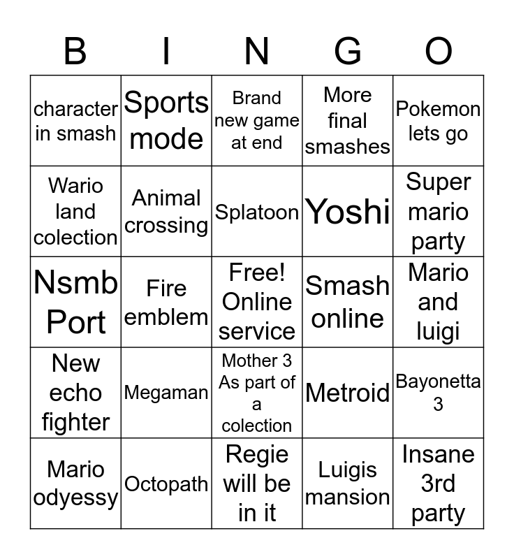 This bingo card has a free space and 24 words: Megaman, Octopath, Splatoon, Mario odyessy, Pokemon lets go, character in smash, Wario land colection, Sports mode, Smash online, Mother 3 As part of a colection, Yoshi, Nsmb Port, Metroid, Bayonetta 3, Animal crossing, Luigis mansion, Mario and luigi, Brand new game at end, Super mario party, Fire emblem, Insane 3rd party, New echo fighter, More final smashes and Regie will be in it.