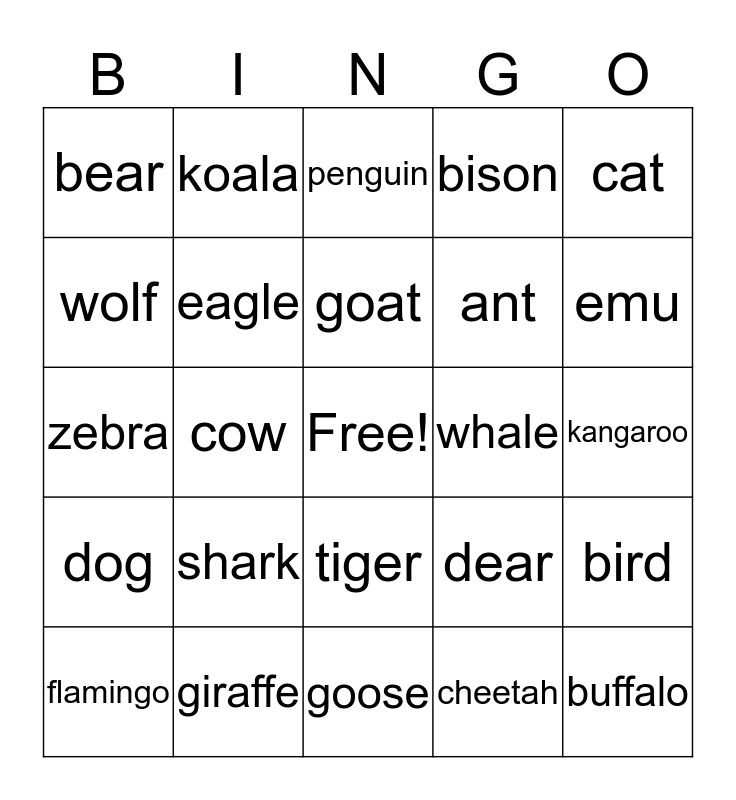 This bingo card has a free space and 40 words: lion, zebra, owl, eagle, giraffe, tiger, goat, sheep, cat, dog, cow, bison, buffalo, kangaroo, whale, shark, seal, bear, polar bear, penguin, bird, cheetah, ant, wolf, fox, fox, toad, crab, crane, crocodile, gecko, flamingo, hippo, dear, emu, goose, horse, iguana, koala and lizard.