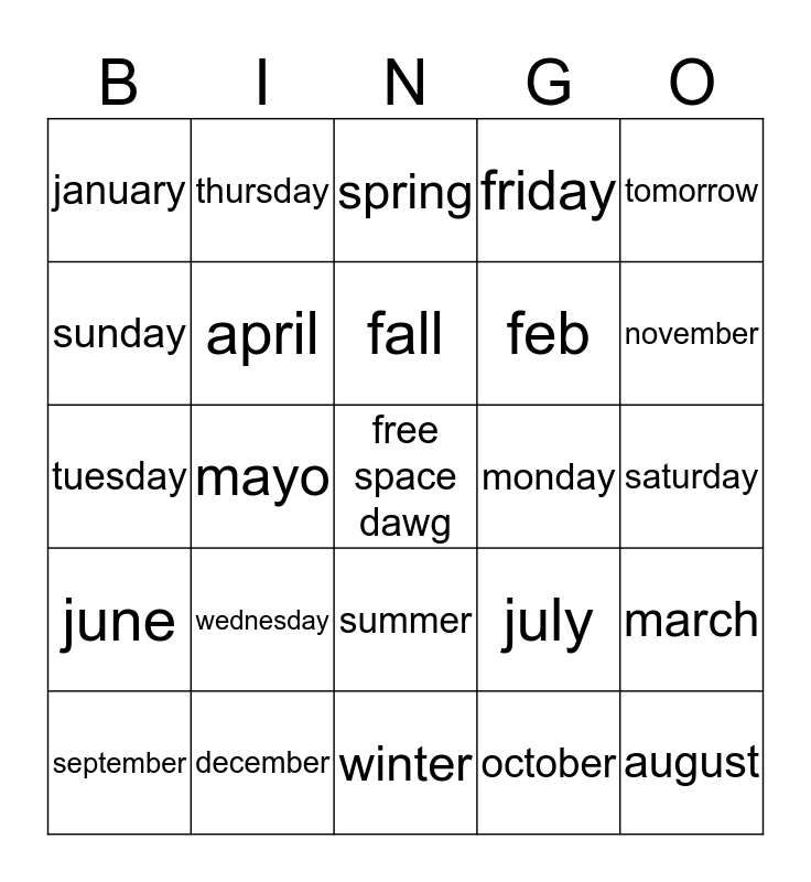 This bingo card has a free space and 24 words: wednesday, december, fall, september, tomorrow, january, sunday, thursday, monday, summer, feb, tuesday, july, march, april, october, saturday, spring, november, mayo, august, june, friday and winter.