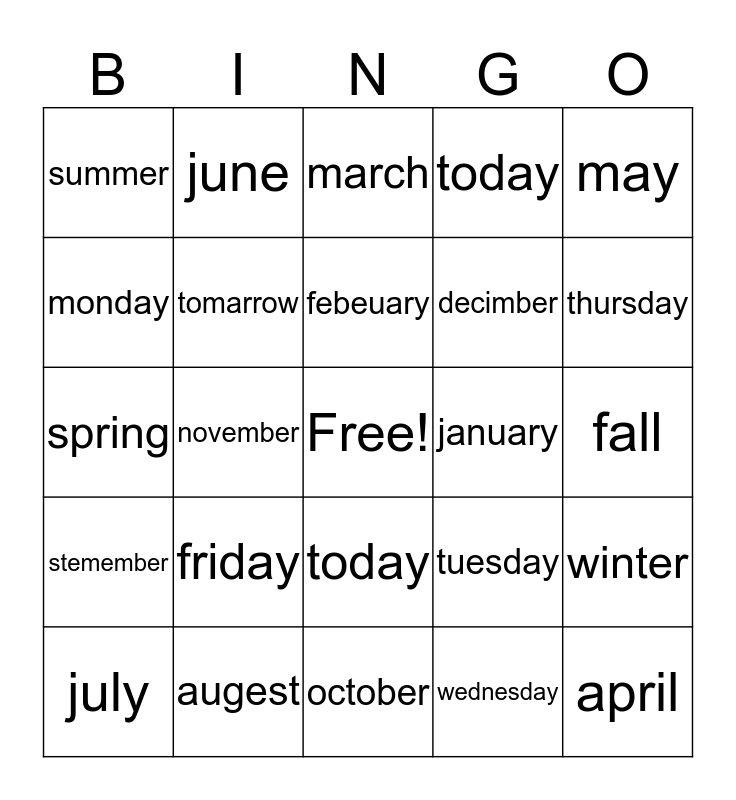 This bingo card has a free space and 24 words: friday, augest, febeuary, july, may, summer, monday, june, january, today, decimber, spring, tuesday, winter, tomarrow, wednesday, fall, march, thursday, november, april, stemember, today and october.