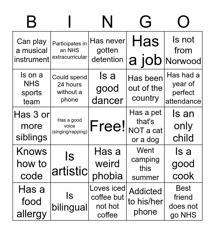 This bingo card has a free space and 24 words: Is artistic, Is bilingual, Is a good dancer, Has a food allergy, Is not from Norwood, Can play a musical instrument, Is on a NHS sports team, Participates in an NHS extracurricular, Has a pet that's NOT a cat or a dog, Has a weird phobia, Has been out of the country, Has 3 or more siblings, Went camping this summer, Is a good cook, Could spend 24 hours without a phone, Addicted to his/her phone, Is an only child, Has never gotten detention, Has had a year of perfect attendance, Has a good voice (singing/rapping), Best friend does not go NHS, Knows how to code, Has a job and Loves iced coffee but not hot coffee.