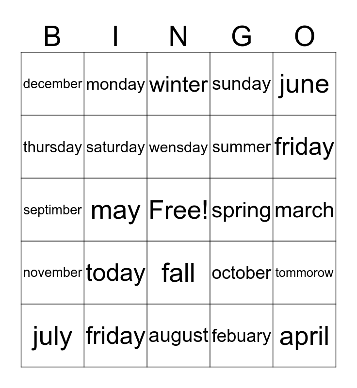 This bingo card has a free space and 24 words: today, friday, wensday, july, june, december, thursday, monday, spring, fall, summer, septimber, october, tommorow, saturday, febuary, march, winter, friday, may, april, november, sunday and august.