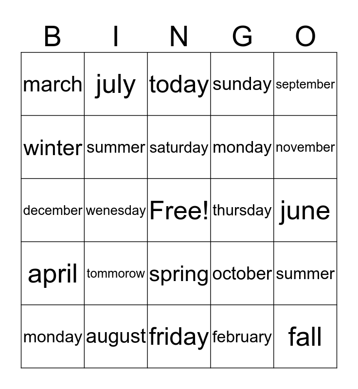 This bingo card has a free space and 24 words: tommorow, august, saturday, monday, september, march, winter, july, thursday, spring, monday, december, october, summer, summer, february, june, today, november, wenesday, fall, april, sunday and friday.