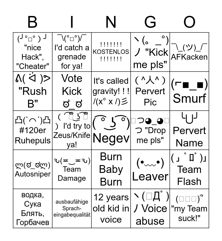 This bingo card has a free space and 24 words: ԅ(≖‿≖ԅ) Team Damage, ausbaufähige Sprach- eingabequalität, It's called gravity! ! ! /(x° x /)彡, водка, Сука Блять, Горбачев, ¯\_(ツ)_/¯ AFKacken, (╯°□°)╯ "nice Hack", "Cheater", ᕕ( ᐛ )ᕗ "Rush B", ¯\(°□°)/¯ I'd catch a grenade for ya!, ༼つ◕_◕༽つ "Drop me pls", Burn Baby Burn, (^人^) Pervert Pic, 凸(`⌒´)凸 #120er Ruhepuls, (•﹏•) Leaver, (」゚ロ゚)」 Team Flash, Vote Kick ಠ_ಠ, ヽ(゚Д゚)ノ Voice abuse, ╰⋃╯ Pervert Name, ! ! ! ! ! ! ! KOSTENLOS ! ! ! ! ! ! !, (⌐■_■) Smurf, (´ ͡༎ຶ ͜ʖ ͡༎ຶ ) I'd try to Zeus/Knife ya!, (ᗒᗣᗕ)՞ "my Team suck!", ლ(ಠ_ಠლ) Autosniper, ヽ(。_°)ノ "Kick me pls" and 12 years old kid in voice.