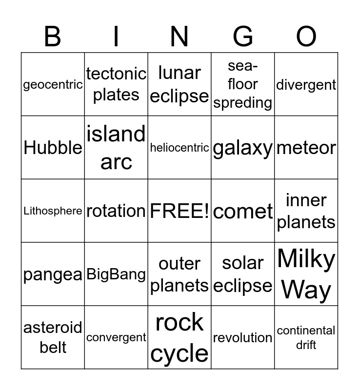 This bingo card has a free space and 24 words: BigBang, convergent, heliocentric, asteroid belt, divergent, geocentric, Hubble, tectonic plates, comet, outer planets, galaxy, Lithosphere, solar eclipse, Milky Way, island arc, revolution, inner planets, lunar eclipse, meteor, rotation, continental drift, pangea, sea-floor spreding and rock cycle.