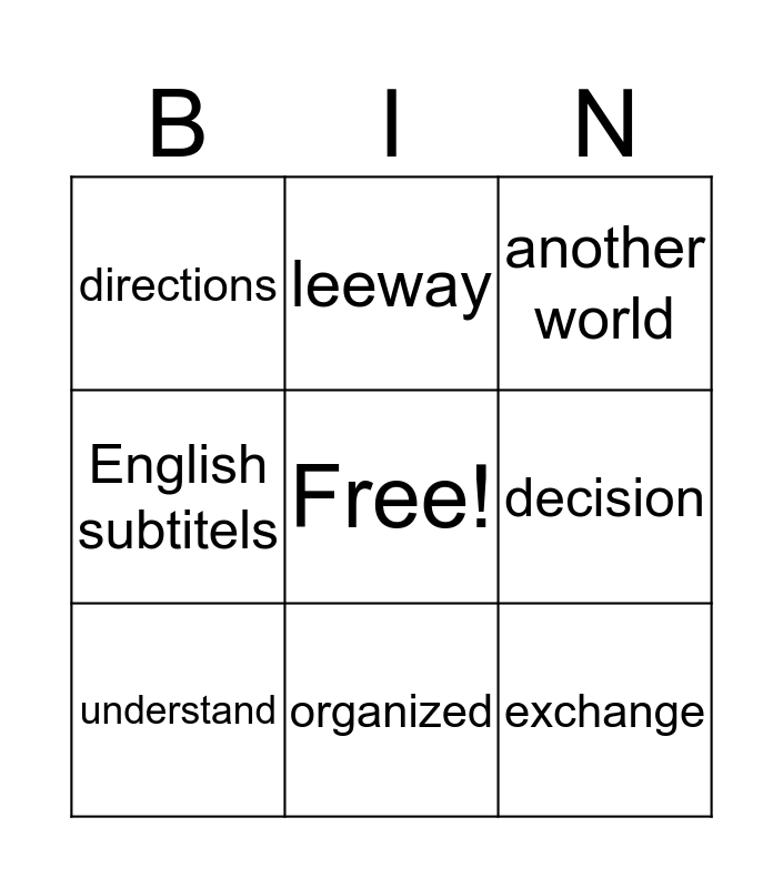 This bingo card has a free space and 12 words: summer, trip, exchange, decision, leeway, another world, organized, mental carts, directions, English subtitels, understand and experience.
