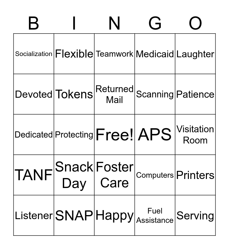 This bingo card has a free space and 25 words: Snack Day, Happy, Returned Mail, Listener, Laughter, Socialization, Devoted, Flexible, APS, Foster Care, Scanning, Dedicated, Computers, Printers, Tokens, Agency Cars, Visitation Room, Teamwork, Patience, Protecting, Serving, SNAP, TANF, Medicaid and Fuel Assistance.