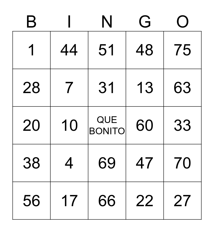This bingo card has a free space and 24 words: 4, 17, 31, 56, 75, 1, 28, 44, 60, 69, 13, 20, 47, 70, 7, 22, 33, 51, 63, 10, 27, 38, 48 and 66.