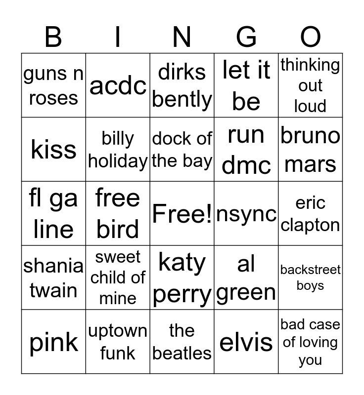 This bingo card has a free space and 24 words: sweet child of mine, uptown funk, dock of the bay, pink, thinking out loud, guns n roses, kiss, acdc, nsync, katy perry, run dmc, fl ga line, al green, backstreet boys, billy holiday, elvis, eric clapton, dirks bently, bruno mars, free bird, bad case of loving you, shania twain, let it be and the beatles.