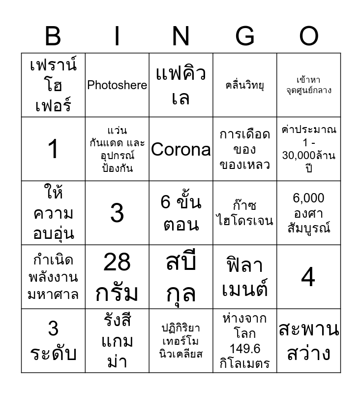 This bingo card has a free space and 34 words: เป็นวัตถุทรงกลมใหญ่, ห่างจากโลก 149.6 กิโลเมตร, ใหญ่กว่าโลก, หลอดไฟ 3000 ล้านล้านล้านล้านแรงเทียน, กำเนิดพลังงานมหาศาล, แว่นกันแดด และอุปกรณ์ป้องกัน, เข้าหาจุดศูนย์กลาง, 3 ระดับ, Photoshere, Chromosphere, Corona, แฟคิวเล, หมุนรอบตัว, ประมาณ 1เดือน, ก๊าซไฮโดรเจน, ค่าประมาณ 1 - 30,000ล้านปี, รังสีแกมม่า, ให้ความอบอุ่น, 28 กรัม, ฟิลาเมนต์, สบีกุล, มืดคล้ำที่ขอบดวง เป็นดอกดวง, เฟราน์โฮเฟอร์, 6,000 องศาสัมบูรณ์, ปฏิกิริยาเทอร์โมนิวเคลียส, สะพานสว่าง, คลื่นวิทยุ, กาลิเอโอ กาลิเลอี, การเดือดของของเหลว, 1, 2, 3, 4 and 5.