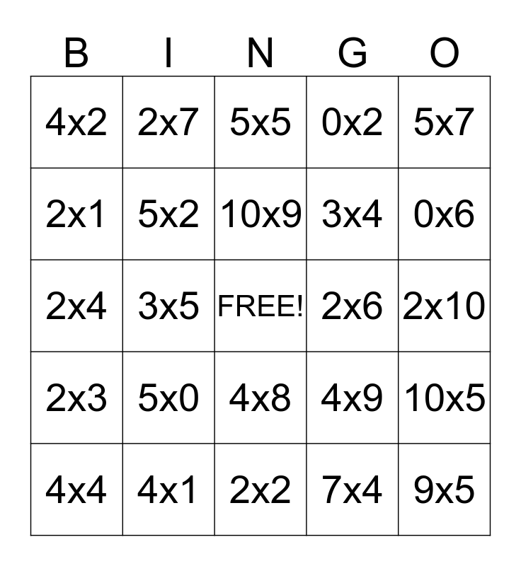 This bingo card has a free space and 31 words: 2x2, 0x4, 3x5, 4x10, 4x2, 5x5, 5x2, 4x9, 2x6, 7x4, 2x10, 9x5, 5x6, 2x9, 0x6, 4x6, 10x5, 5x0, 2x3, 4x8, 5x7, 8x2, 4x4, 2x7, 3x4, 2x1, 0x2, 2x4, 4x1, 10x9 and 6x0.