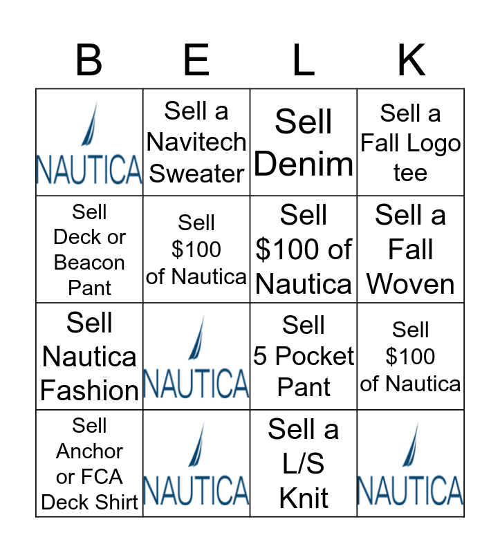 This bingo card has 4 images and 12 words: Sell $100 of Nautica, Sell Denim, Sell Nautica Fashion, Sell a Navitech Sweater, Sell 5 Pocket Pant, Sell a L/S Knit, Sell Deck or Beacon Pant, Sell $100 of Nautica, Sell Anchor or FCA Deck Shirt, Sell a Fall Logo tee, Sell a Fall Woven and Sell $100 of Nautica.