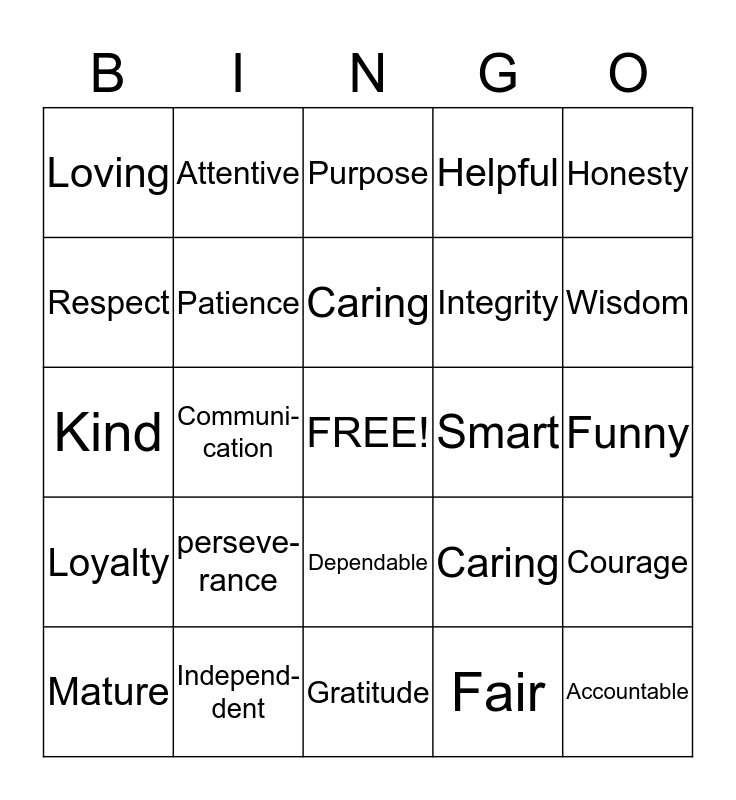 This bingo card has a free space and 24 words: perseve- rance, Independ- dent, Caring, Mature, Honesty, Loving, Respect, Attentive, Smart, Dependable, Integrity, Kind, Caring, Courage, Patience, Fair, Funny, Purpose, Wisdom, Communi- cation, Accountable, Loyalty, Helpful and Gratitude.
