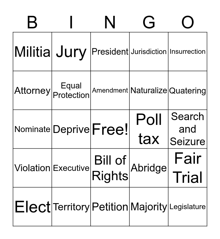 This bingo card has a free space and 24 words: Executive, Territory, Amendment, Elect, Insurrection, Militia, Attorney, Jury, Poll tax, Bill of Rights, Naturalize, Nominate, Abridge, Fair Trial, Equal Protection, Majority, Search and Seizure, President, Quatering, Deprive, Legislature, Violation, Jurisdiction and Petition.