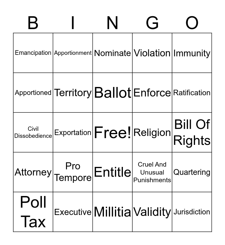 This bingo card has a free space and 24 words: Pro Tempore, Executive, Ballot, Poll Tax, Immunity, Emancipation, Apportioned, Apportionment, Religion, Entitle, Enforce, Civil Dissobedience, Cruel And Unusual Punishments, Quartering, Territory, Validity, Bill Of Rights, Nominate, Ratification, Exportation, Jurisdiction, Attorney, Violation and Millitia.