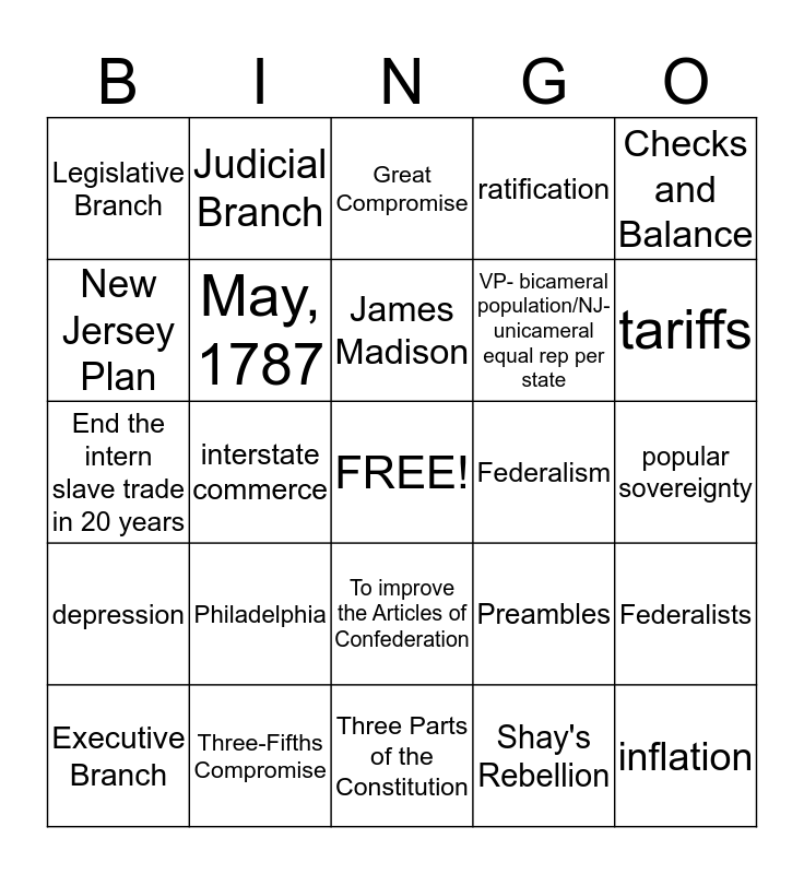 This bingo card has a free space and 24 words: Philadelphia, Three-Fifths Compromise, James Madison, Executive Branch, Checks and Balance, Legislative Branch, New Jersey Plan, Judicial Branch, Federalism, To improve the Articles of Confederation, VP- bicameral population/NJ-unicameral equal rep per state, End the intern slave trade in 20 years, Preambles, Federalists, May, 1787, Shay's Rebellion, popular sovereignty, Great Compromise, tariffs, interstate commerce, inflation, depression, ratification and Three Parts of the Constitution.