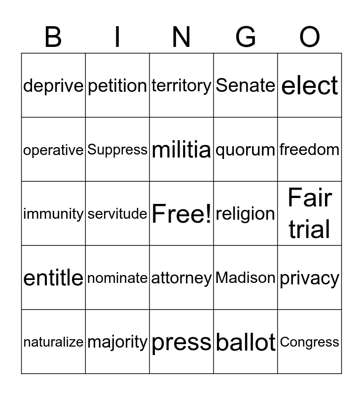 This bingo card has a free space and 24 words: nominate, majority, militia, naturalize, elect, deprive, operative, petition, religion, attorney, quorum, immunity, Madison, privacy, Suppress, ballot, Fair trial, territory, freedom, servitude, Congress, entitle, Senate and press.