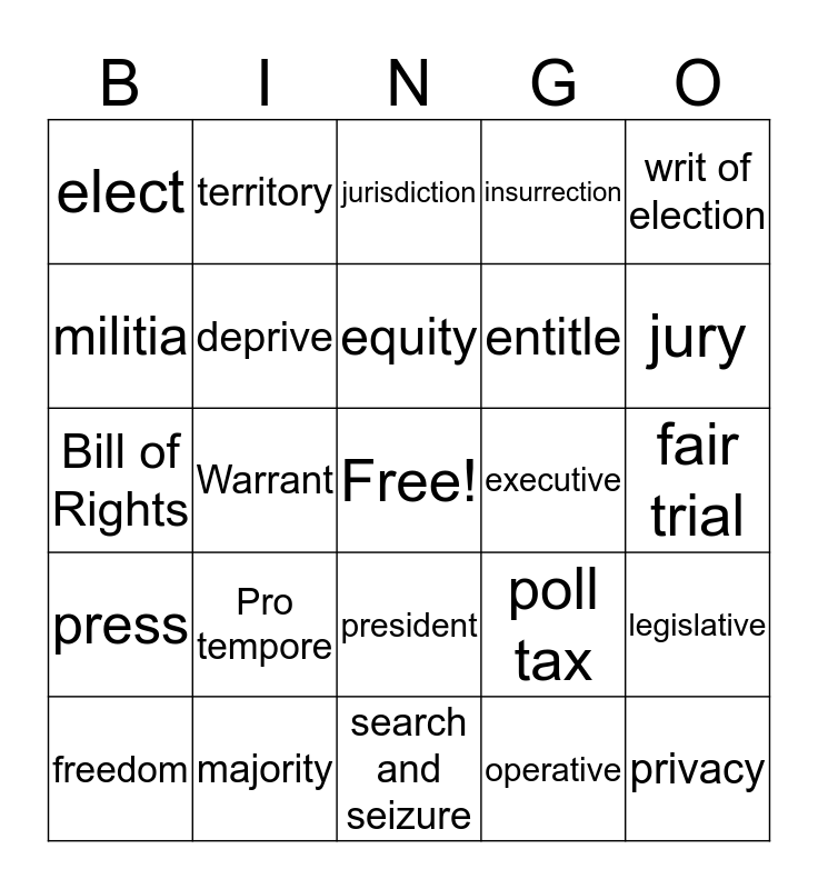 This bingo card has a free space and 24 words: Pro tempore, majority, equity, freedom, writ of election, elect, militia, territory, executive, president, entitle, Bill of Rights, poll tax, legislative, deprive, operative, fair trial, jurisdiction, jury, Warrant, privacy, press, insurrection and search and seizure.