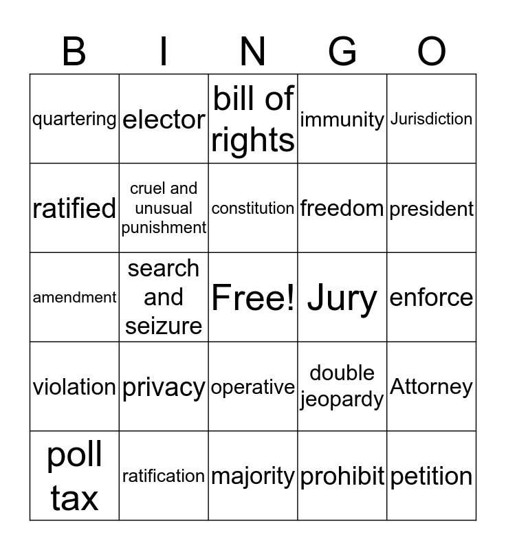 This bingo card has a free space and 24 words: privacy, ratification, constitution, poll tax, Jurisdiction, quartering, ratified, elector, Jury, operative, freedom, amendment, double jeopardy, Attorney, cruel and unusual punishment, prohibit, enforce, bill of rights, president, search and seizure, petition, violation, immunity and majority.