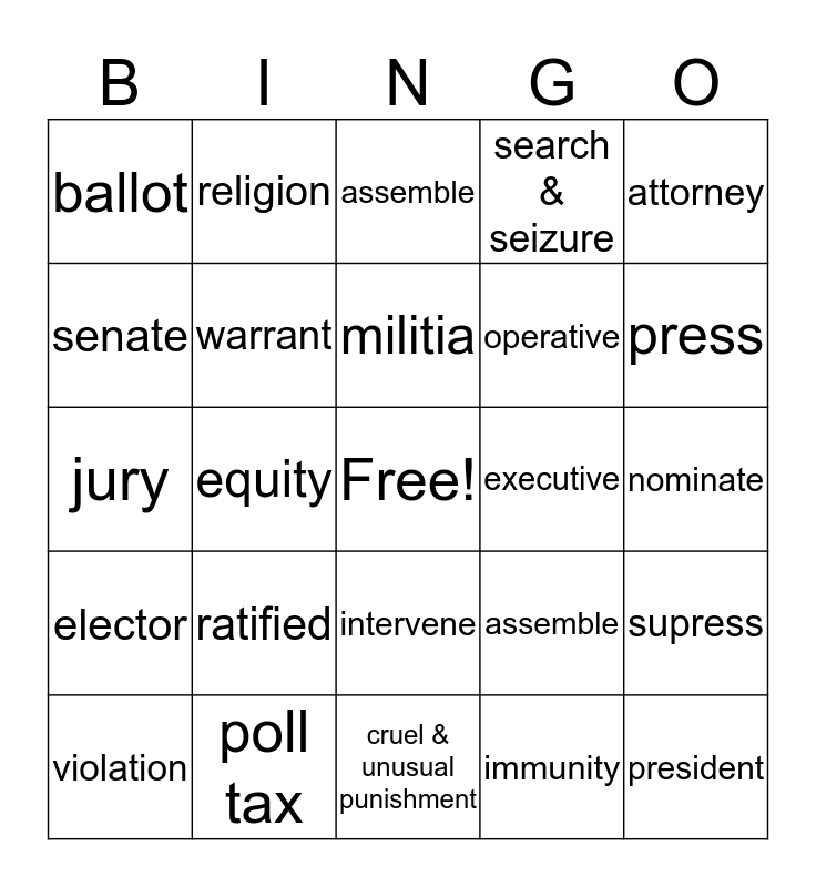 This bingo card has a free space and 24 words: ratified, poll tax, militia, violation, attorney, ballot, senate, religion, executive, intervene, operative, jury, assemble, supress, warrant, immunity, nominate, assemble, press, equity, president, elector, search & seizure and cruel & unusual punishment.