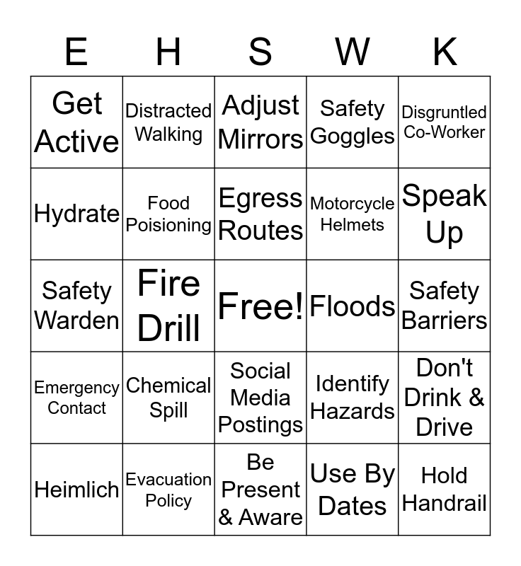 This bingo card has a free space and 24 words: Chemical Spill, Evacuation Policy, Egress Routes, Heimlich, Disgruntled Co-Worker, Get Active, Hydrate, Distracted Walking, Floods, Social Media Postings, Motorcycle Helmets, Safety Warden, Identify Hazards, Don't Drink & Drive, Food Poisioning, Use By Dates, Safety Barriers, Adjust Mirrors, Speak Up, Fire Drill, Hold Handrail, Emergency Contact, Safety Goggles and Be Present & Aware.