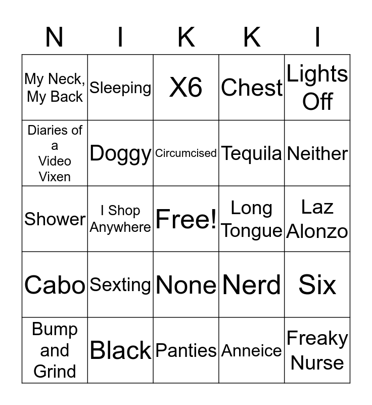 This bingo card has a free space and 24 words: Sexting, Black, Circumcised, Bump and Grind, Lights Off, My Neck, My Back, Diaries of a Video Vixen, Sleeping, Long Tongue, None, Tequila, Shower, Nerd, Six, Doggy, Anneice, Laz Alonzo, X6, Neither, I Shop Anywhere, Freaky Nurse, Cabo, Chest and Panties.