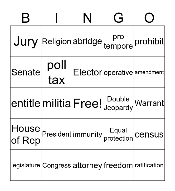 This bingo card has a free space and 24 words: President, Congress, Elector, legislature, prohibit, Jury, Senate, Religion, Double Jeopardy, immunity, operative, entitle, Equal protection, census, poll tax, freedom, Warrant, abridge, amendment, militia, ratification, House of Rep, pro tempore and attorney.