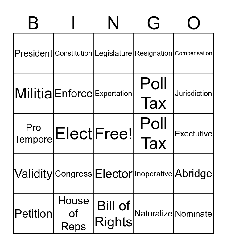 This bingo card has a free space and 24 words: Congress, House of Reps, Exportation, Petition, Compensation, President, Militia, Constitution, Poll Tax, Elector, Poll Tax, Pro Tempore, Inoperative, Abridge, Enforce, Naturalize, Exectutive, Legislature, Jurisdiction, Elect, Nominate, Validity, Resignation and Bill of Rights.