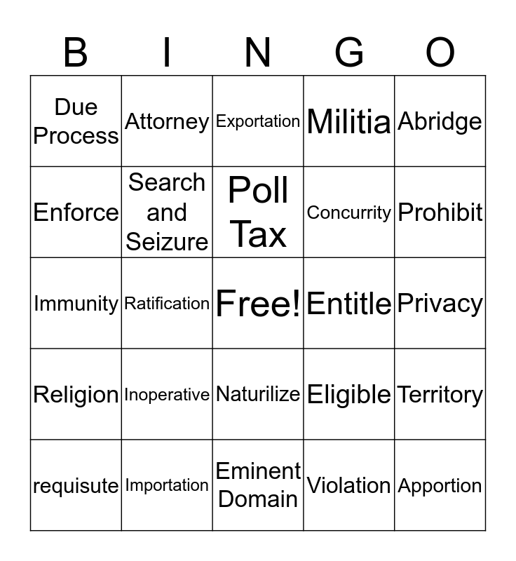 This bingo card has a free space and 24 words: Inoperative, Importation, Poll Tax, requisute, Abridge, Due Process, Enforce, Attorney, Entitle, Naturilize, Concurrity, Immunity, Eligible, Territory, Search and Seizure, Violation, Privacy, Exportation, Prohibit, Ratification, Apportion, Religion, Militia and Eminent Domain.