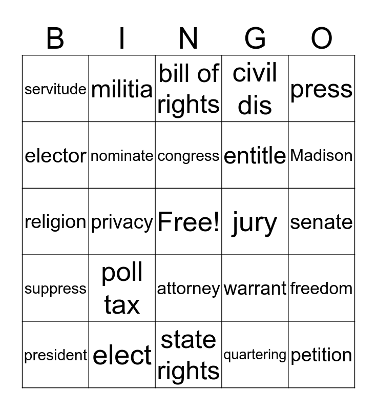 This bingo card has a free space and 24 words: poll tax, elect, congress, president, press, servitude, elector, militia, jury, attorney, entitle, religion, warrant, freedom, nominate, quartering, senate, bill of rights, Madison, privacy, petition, suppress, civil dis and state rights.