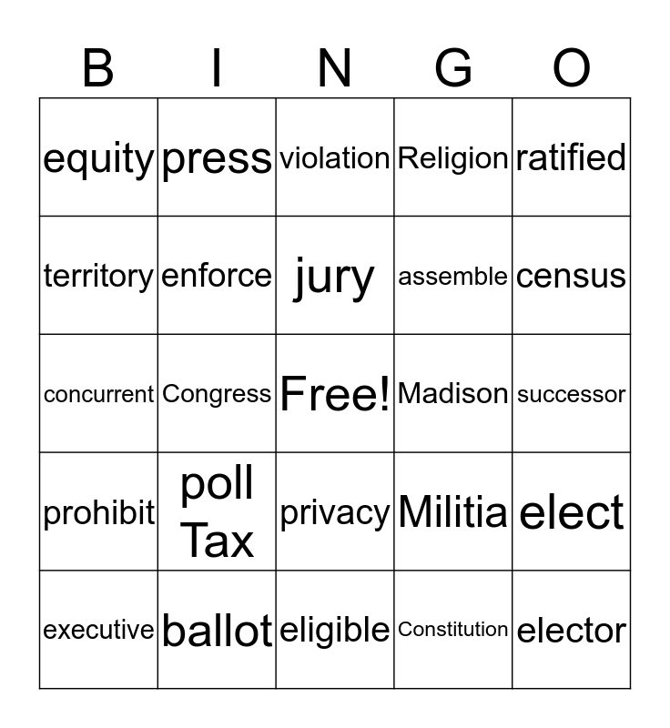 This bingo card has a free space and 24 words: poll Tax, ballot, jury, executive, ratified, equity, territory, press, Madison, privacy, assemble, concurrent, Militia, elect, enforce, Constitution, successor, violation, census, Congress, elector, prohibit, Religion and eligible.