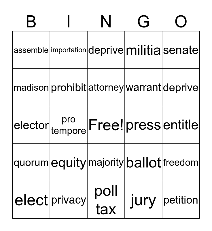 This bingo card has a free space and 24 words: elect, equity, attorney, jury, senate, assemble, importation, deprive, press, entitle, elector, prohibit, ballot, freedom, madison, privacy, poll tax, militia, deprive, quorum, pro tempore, majority, warrant and petition.